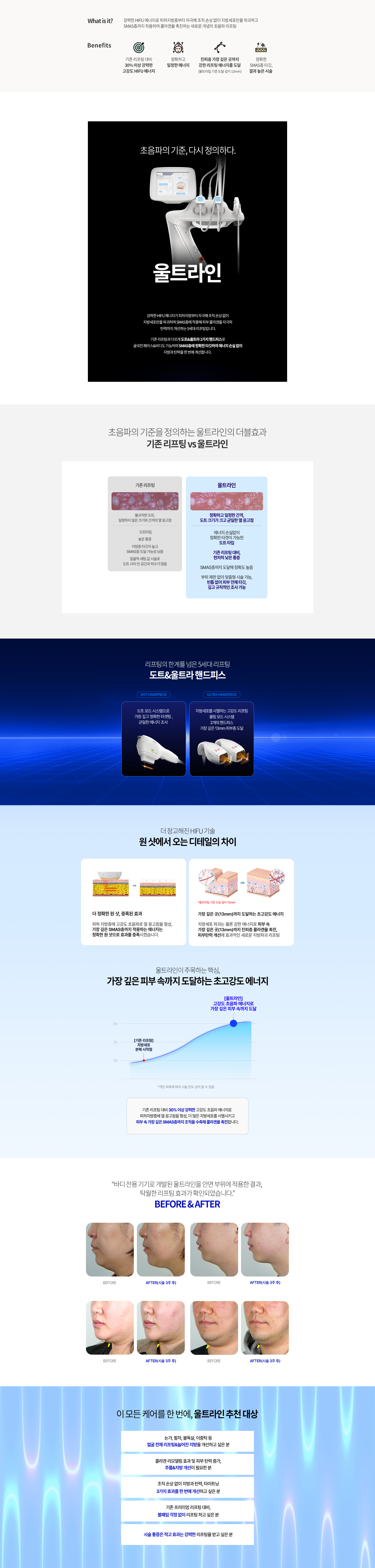 - 기존 리프팅 대비 30% 이상 강력한 고강도 초음파 에너지로